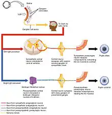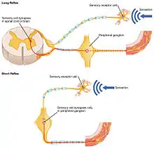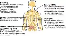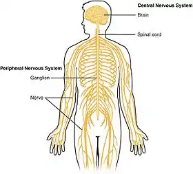 ![]() مخطط يظهر الجهاز العصبي المركزي بلون وردي والجهاز العصبي المحيطي بلون برتقالي | |
