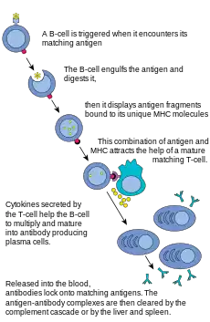وخلايا البلازما هي خلايا قصيرة الأجل (يومان-3 أيام) تفرز أجسامًا مضادةً. وترتبط هذه الأجسام المضادة بالمستضدات، بحيث تجعلها أهدافًا سهلة بالنسبة للخلايا الملتهمة، وتنشط تتابع مجموعات المكمل (تعاقب تنشيط البروتينات الموجهة لتدمير الخلايا الدخيلة).[2] وستظل نحو %10 من خلايا البلازما حية لتصبح خلايا ذاكرة بائية طويلة الأجل نوعية المستضدات.[2] ونظرًا لأن هذه الخلايا مبرمجة بالفعل على إنتاج أجسام مضادة نوعية، فإنه يمكن توجيه أوامر لها للاستجابة بشكل سريع، في حالة ما إذا أصاب نفس العامل الممرض الخلية المضيفة مجددًا، في حين أن الخلية المضيفة تظهر عليها أعراض بسيطة، إن وجدت.