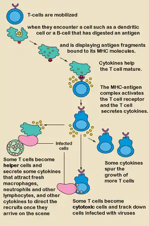 ويمكن تنشيط عدة مجموعات فرعية من الخلايا التائية بواسطة خلايا عارضة للمستضد متخصصة، وكل نوع من الخلايا التائية مزود بشكل خاص من أجل التعامل مع كل عنصر سام أو عامل ممرض بكتيري أو فيروسي على حدة. ويعتمد نوع الخلية التائية التي تم تنشيطها ونوع الاستجابة المولدة، جزئيًا، على المحيط الذي حدثت فيه أول مواجهة بين الخلايا العارضة للمستضد المتخصصة والمستضد.[2]