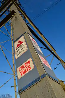 يمثل الاتصال بموصلات الخط أو الاقتراب منه خطر التعرض للصعق الكهربائي . قد يؤدي ملامسة الأسلاك العلوية إلى الإصابة أو الوفاة. السلالم المعدنية، والمعدات الزراعية، وصواري القوارب، وآلات البناء، والهوائيات الهوائية، والأشياء المماثلة كثيرًا ما تكون متورطة في اتصال مميت مع الأسلاك العلوية. كثيرًا ما يكون الأشخاص غير المصرح لهم الذين يتسلقون أبراج الطاقة أو الأجهزة الكهربائية ضحايا للصعق بالكهرباء. [14] في الجهود الفولتية العالية جدًا للإرسال، حتى الاقتراب القريب يمكن أن يكون خطيرًا، حيث قد يتقوس الجهد العالي عبر فجوة هوائية كبيرة.
