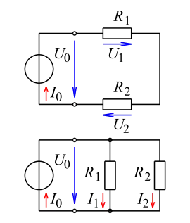 طبقا للدائرة السفل في الشكل يوجد المصدر وكل من المقاومتين موصولين من أعلى وأسفل بنفس السلك ومسلط عليهم نفس الجهد .