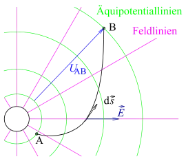 وعند إزاحة شحنة على نفس دائرة تساوي الكمون يكون التكامل مساويا للصفر ، ذلك لأنه على ذلك المسار تكون , وبالتالي يكون حاصل الضرب القياسي مساويا للصفر.