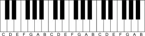 مفاتيح البيانو ( ثلاثة أوكتافات). التسمية هنا تسمية ألمانية، بمعني أن "دو" هي "C"، و"ري" هي "D"، وهكذا.