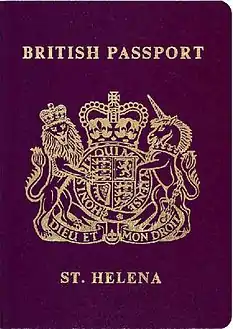 ![]() الغطاء الأمامي لجواز سفر بريطاني صدر في الأقاليم التابعة لبريطانيا لمواطن من سانت هيلينا. (نسخة 2012) [1] | ||||