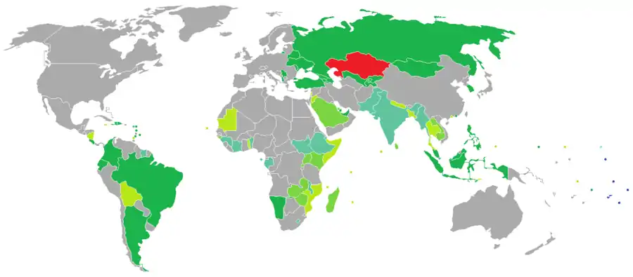 البلدان والأقاليم التي لا تفرض تأشيرة أو تطلب تأشيرة دخول عند الوصول للجهة، لحاملي جوازات السفر الكازاخستانية العادية.