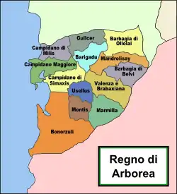 حكم أربوريا (بالإيطالية: Giudicato di Arborea), بالسردينية:Giuigadu de Arborea) كانت واحدة من أربع قضاءات مستقلة تم تقسيم جزيرة سردينيا في العصور الوسطى المتوسطة وتقع بين لوجودرو إلى الشمال والشرق، وكالياري إلى الجنوب والشرق، والبحر المتوسط في الغرب، وإلى الشمال الغربي، يقع خارج Logudoro GALLURA.[1] تغلب اربوريا جيرانها، بقيت على قيد الحياة في القرن الخامس عشر. وكان أقرب مقعد قضائي معروف باسم ثاروس (Tarra).