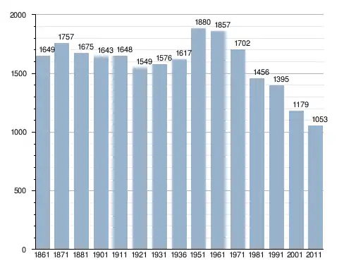 في سنة 1861 بلغ عدد السكان 1٬649 نسمة، وتطور العدد ليصل في سنة 2011 لـ 1٬053 نسمة.