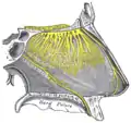 - في جوار الجدار الأنسي للحجاج حيث يوجد العصب الأنفي الهدبي.[2]