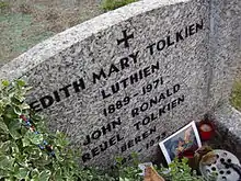 توفيت إديث ـ زوجة تولكين ـ في 29 نوفمبر 1971، وهي في الثانية والثمانين من عمرها[56]، فدفنها تولكين في مقبرة وولفركوت بمدينة أكسفورد، ونقش على قبرها اسم "لوثيان" (بالإنجليزية: Lúthien)، وهو اسم معشوقة خيالية، بطلة إحدى قصص الغرام التي خلدها تولكين في أعماله. وعندما لحق تولكين بزوجته بعد 21 شهراً (في 2 سبتمبر 1973) دفن معها في نفس القبر، ونقش أسفل اسمه اسم "بيرين" (بالإنجليزية: Beren) وهو أمير وعاشق خيالي، خلد تولكين قصة حبه للوثيان.