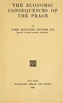 للتعبير عن أفكاره وتحفظاته تجاه معاهدة فرساي، كتب «التوابع الاقتصادية للسلام»، وقد نتج عن ذلك الكتاب دخول كينز في عالم الأثرياء واكتسابه شهرة دولية. وقد عاتب كينز في ذلك الكتاب جورج كليمانصو لدفاعه ونصرته لحل متأثر بنظرية الواقعية السياسية ووقوفه بجانب وودرو ويلسون ولويد جورج، بدلًا من الدفاع عن أفكاره القريبة من النظرية الليبرالية المفضلة للسلام وللتنمية الاقتصادية، ونتيجةً لذلك وجه أشد النقد تجاه الأخيرين. ورغم ذلك النجاح الكبير إلا الكتاب لم ينجح بفرنسا[lower-alpha 7]، حتى أنه في عام 1946، قام الاقتصادي الفرنسي إيتيان مانتو بنشر كتاب «السلام القرطاجي أو التوابع للاقتصادية للسيد كينز» بغرض تفنيد حجج كينز. أما بالنسبة لشارل كيندلبرغ[lower-alpha 8]، فقد جرح ذلك الكتاب الشعور الفرنسي، ما يفسر نفور اقتصاديي فرنسا من الكتاب وعدم اهتمامهم به إلا من بعد الحرب العالمية الثانية.
