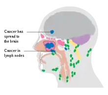 قد يغزو السرطان الجيب الفكي الحنكي ويسبب ألم الأسنان. قد يسد أيضًا القناة الأنفية الدمعية. انتشار الورم في محجر العين يسبب جحوظ العين.