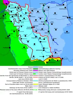 ![]() Polish map of Cieszyn Silesia. The solid black line is the historical border of the region, and the broken black line is the international border. | |||