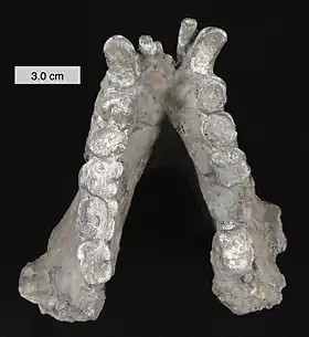 ![]() الفك السفلي لجيغانتوبيثيكوس بلاكي، أحد أنواع الجيغانتوبيثيكوس | |