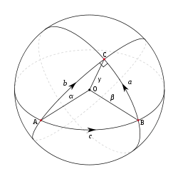 المثلث الجيوديسي المرسوم على الكرة، والجيوديسي هي أقواس الدائرة العظمى.