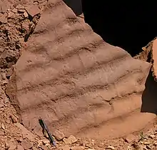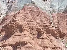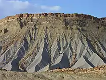 - وحدة تشكيل جرف علوية تبلغ سمكها من 120 إلى 130 قدمًا (من 37 إلى 40 مترًا) ذات حجر غريني برتقالي مائل للحمرة.