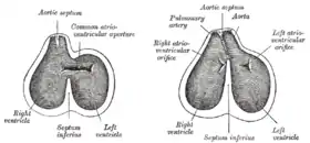 ![]() Diagrams to show the development of the septum of the aortic bulb and of the ventricles. | |