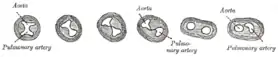 ![]() Transverse sections through the aortic bulb to show the growth of the aortic septum. The lowest section is on the left, the highest on the right of the figure. Transverse sections through the aortic bulb to show the growth of the aortic septum. The lowest section is on the left, the highest on the right of the figure. | |