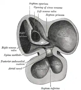 ![]() المناطق الداخلية من النصف الخلفي (الظهري) من قلب جنين آدمى عمره حوالي ثلاثين يوما. (الحاجز الأولي يظهر في أعلى الرسم معنوناً بالإنجليزية "Septum primum".)