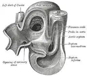 ![]() المناطق الداخلية من النصف الخلفى (الظهري) من قلب جنين بشري عمره حوالى خمسة وثلاثون يوما. (يُرى الحاجز الثانوي نازلا من أعلى وغير مكتمل) | |