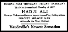 - ^ "World's Greatest Human Wonder, Hadji Ali" (fee required). The Bridgeport Telegram (Bridgeport, CT). September 17, 1926. p. 5.