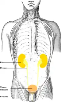 ![]() 1. الجهاز البولي للإنسان: 2. كلية، 3. حويضة، 4. حالب، 5. مثانة، 6. إحليل. (الإحليل الأيسر يظهر بمقطع أمامي) 7. الغدة الكظرية الأوعية: 8. الشريان الكلوي والوريد الكلوي، 9. الوريد الأجوف السفلي، 10. الأبهر البطني، 11. شريان حرقفي أصلي ووريد حرقفي أصلي أعضاء أخرى: 12. كبد، 13. الأمعاء الغليظة، 14. حوض (تشريح) 1. الجهاز البولي للإنسان: 2. كلية، 3. حويضة، 4. حالب، 5. مثانة، 6. إحليل. (الإحليل الأيسر يظهر بمقطع أمامي) 7. الغدة الكظرية الأوعية: 8. الشريان الكلوي والوريد الكلوي، 9. الوريد الأجوف السفلي، 10. الأبهر البطني، 11. شريان حرقفي أصلي ووريد حرقفي أصلي أعضاء أخرى: 12. كبد، 13. الأمعاء الغليظة، 14. حوض (تشريح) | |