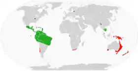 ![]() التوزيع العالمي لحاملات المخالب: Peripatidae بالأخضر و Peripatopsidae أحمر. | |