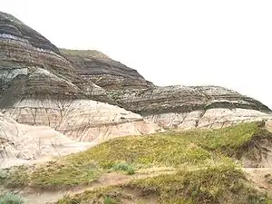 أرض وعرة بالقرب من درامهيلر، ألبرتا، حيث تظهر حدود ط-ب بفعل عوامل التعرية وذوبان الجليد.
