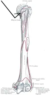 ![]() عظم العضد الأيسر. عرض أمامي. الحديبة الصغيرة للعضدي تظهر أعلاه. | |