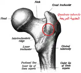 |CitationClass=تم تجاهله (مساعدة); تحقق من التاريخ في:|تاريخ أرشيف=(مساعدة) - Sunderland S (January 1938). "The Quadrate Tubercle of the Femur". J. Anat. 72 (Pt 2): 309–12. PMC 1252427. PMID 17104699. الوسيط
