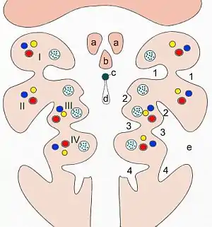 نموذج للأقواس الخيشومية. الأقواس الخيشومية من I إلى IV، من 1 إلى 4 الجيبات البلعومية (من الداخل) و الثلم البلعومي (من الخارج)