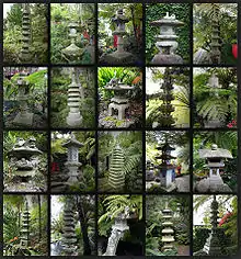 - الفانوس: مع بداية الاحتفاء بطقوس الشاي، أخذت الفوانيس مكانها في تركيبة الحدائق اليابانية. كانت وظيفتها الأصلية إرشاد الزوار أثناء قيامهم ببعض المراسيم الليلية، يعتقد أن النور التي تبثه هو بمثابة شعاع المعرفة والذي سيقوم بطرد سحابة الجهل التي تطوف في المكان. عادة ما يتم نحت هذه الفوانيس على الصخور.