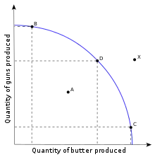 فعلى سبيل المثال، بافتراض أن عرض عناصر الإنتاج للاقتصاد لا تتغير بمرور الزمن، فحتى تتمكن من إنتاج المزيد من الزبدة، سوف يتم التضحية بإنتاج «البنادق». فإذا تحققت الكفاية الإنتاجية، فإن الاقتصاد يتمكن من الاختيار بين مجموعات (أي نقاط) على حد إمكانية الإنتاج: ب إذا كانت البنادق محل الاهتمام، وج إذا كان من الضروري إنتاج المزيد من الزبدة، ود إذا كان المطلوب إنتاج كميات متساوية من الزبدة والبنادق.