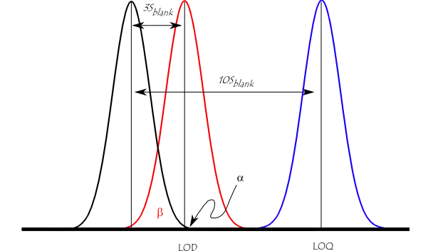 يمكن إبراز العلاقة بين حد الكشف وبين مفهوم آخر وهو حد التعيين الكمي (LOQ) وبين العينة الشاهدة بالشكل المرفق، حيث يظهر دالة الكثافة الاحتمالية لقياسات موزعة طبيعياً عند العينة الشاهدة (اللون الأسود)، وعند حد الكشف المعرف هنا بثلاثة أضعاف الانحراف المعياري للعينة الشاهدة (اللون الأحمر)، وعند حد التعيين الكمي المعرف هنا بعشرة أضعاف الانحراف المعياري للعينة الشاهدة (اللون الأزرق). تكون الإشارة عند LOD ذات احتمالية الخطأ من النوع الأول (خطأ ألفا / احتمالية الخطأ الإيجابي) صغيرة (1 %)، إلا أن احتمالية الخطأ من النوع الثاني (خطأ بيتا / احتمالية الخطأ السلبي) مرتفعة (50 %). مما يعني أن العينة قد تحوي شائبة عند LOD باحتمالية 50%؛ إلا أنه بالمقابل تكون احتمالية الخطأ السلبي عند LOQ منخفضة للغاية.