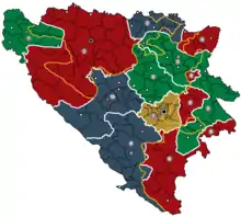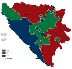 قادت انتخابات 1990 إلى تكوين مجلس برلماني يهيمن عليه ثلاثة أحزاب على أساس عرقي وطائفي، وقد شكلت تحالفا فضفاضا لطرد الشيوعيين من السلطة. ثم أعلنت كلا من كرواتيا واعقبتها سلوفينيا الاستقلال، فالحرب التي تلت ذلك وضعت البوسنة والهرسك والشعوب الثلاثة المكونة لها في موقف حرج. وقد كان هناك انقسام كبير سرعان ماتطور ووضع مسألة ما إذا كان البقاء ضمن الإتحاد اليوغوسلافي (ويؤيده الصرب بشكل ساحق) أو طلب الاستقلال (ويؤيده البشناق والكروات بشكل ساحق). فأعضاء البرلمان الصرب، وخاصة من حزب الصربي الديموقراطي، تركوا البرلمان المركزي في سراييفو وشكلوا برلمانا أسموه المجلس الوطني لصرب البوسنة ولهرسك وذلك في 24 أكتوبر 1991، مما أنهى التعاون العرقي الثلاثي الذي حكم البلاد في أعقاب انتخابات 1990، وهذا المجلس انشأ جمهورية صرب البوسنة والهرسك يوم 9 يناير 1992، ثم غير الاسم إلى الجمهورية الصربية في أغسطس 1992. وفي 18 نوفمبر 1991 كان فرع البوسنة والهرسك للحزب الحاكم في كرواتيا المسمى الاتحاد الديموقراطي الكرواتي (HDZ) أعلن بإنشاء مايسمى بالمجتمع الكرواتي للبوسنة والهرسك وهو منفصل سياسيا وثقافيا واقتصاديا بكامل أراضيه عن إقليم البوسنة والهرسك وله جيش خاص به يسمى بمجلس الدفاع الكرواتي.[10] وهو مالم تعترف به الحكومة البوسنية. واعلنت المحكمة الدستورية البوسنية مرتين بأن تلك الجمهورية غير شرعية، بالمرة الأولى بتاريخ 14 سبتمبر 1992 والثانية في 20 يناير 1994.[11][12]