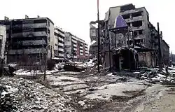 ![]() من اليسار، حريق مبنى البرلمان بعد قصفه بنيران المدفعية في سراييفو مايو 1992، راتكو ملاديتش مع جنود من صرب البوسنة، جندي نرويجي من قوات حفظ السلام في سراييفو. | ||||||||