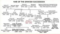 عانى الملك الأسباني كارلوس الثاني عجزاً عقلياً وجسدياً من سن مبكره جدا، وكان من الواضح أنه لا يمكن له انجاب وريثاً وهكذا فإن مسألة ميراث الممالك الإسبانية والتي تشمل ليس فقط إسبانيا، ممتلكات في إيطاليا والبلدان المنخفضة والأمريكتين وأصبحت المسالة مثيرة لجدل، شرعت سلالتان بالمطالبة بالعرش : البوربون الفرنسية وسلالة هابسبورغ النمساوية؛ فالسلالتان كانتا لها صلات وثيقة بملك إسبانيا الراحل.
