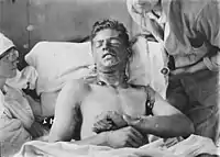 | فتحت نيران البندقية والرشاش بشكل مروع ضدنا ورجالي بدأوا ينهارون، أنا صرخت " انبطحوا " ولكن أكثر الجنود الذين لم يصابوا كانوا قد أخذوا أماكن يحتمون بها، أنا وقعت في حفرة قذيفة وحاولت أن أتحرك لليمين أو اليسار لكن الرصاص شكل برميل منيع من غير الممكن اختراقه وإظهار الرأس يعني موتا محققا. لم يكن أحد من رجالي مرئيا بالنسبة لي ولكن من كل الجهات تأتي الأهات الهزيلة وبكاء الألم، بدأت أعاني من العطش وقنينة مائي ثقبت برصاصة... وأخيرا قررت أن أنتظر حتى الظلمة وحوالي ساعة التاسعة والنصف بدأت الزحف... وأخيرا تم إيقاف النيران وبعد ما مزقت ثيابي ولحمي بسبب الأسلاك وصلت إلى متراس ووقعت إلى أحد خنادقنا المليء بالموتى والمصابين |