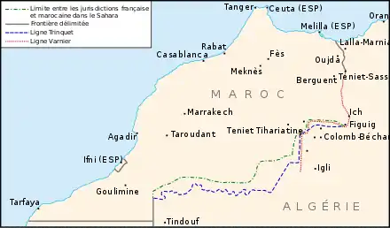 بعد دخول المغرب تحت الحماية الفرنسية في 1912، قررت الإدارة الفرنسية تثبيت الحدود بين البلدين، لكن هذه اتبعت تحديدا سيئا (خط فارنييه 1912 وخط ترنكي 1938) يختلف من خارطة لأخرى.[7] بما أنه في نظر الإدارة الفرنسية ليس ذلك بحدود فعلية والمنطقة أصلا غير مأهولة أي لا تمثل أي أهمية ما.[5] اكتشاف مناجم الحديد والمنغنيز في المنطقة جعل فرنسا تقرر في سنة 1950 تدقيق رسم الحدود وإدخال كل من تندوف وكولومب بشار ضمن المقاطعات الفرنسية للجزائر.