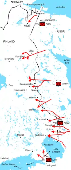 - الجيش الرابع عشر، ضم ثلاثة فرق متمركزة في مورمانسك. كان هدفه الاستيلاء على ميناء بتسامو بالقطب الشمالي ومن ثم التقدم نحو بلدة روفانييمي.