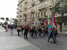 في 10 ديسمبر أقيم في ساحة أزادلق موكب نصر تكريماً لانتصار أذربيجان،[214] حيث استعرض 3000 جندي عسكري تميزوا أثناء الحرب ومعهم الجنود والضباط الأتراك إلى جانب المعدات العسكرية والطائرات بدون طيار والطائرات،[215] بالإضافة إلى استعراضهم بغنائم الأرمن.[216] وحضر الرئيس التركي أردوغان العرض العسكري خلال زيارته لباكو.[217]