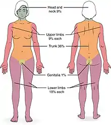 تستخدم قاعدة والاس نسبًا تقدريرية لتحديد مساحة الجسم المتضررة من الحرق، اعتمادًا على أجزاء الجسم المختلقة كما هو موضح بالصورة.