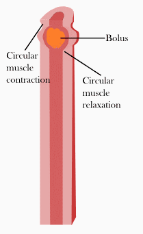بعد أن يمضغ الطعام ويتحول لكتلة قابلة للبلع، يتم ابتلاعه وينتقل عبر المريء. تنقبض العضلات الملساء خلف كتلة الطعام لمنعها من الحركة مرة أخرى نحو الفم، ثم تعمل موجات انقباضية أحادية الاتجاه للتخلص من الطعام بسرعة إلى المعدة. تعمل هذه العملية في اتجاه واحد فقط، وتتمثل وظيفة المريء الوحيدة في نقل الطعام من الفم إلى المعدة.