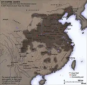 بعد غزو تشي في سنة 221 ق م[10] والإطاحة بكافة الدول المتحاربة قرر ينغ زينغ أنه أصبح تشين شي هوانج وتعني الإمبراطور الأول تشين وبدل لقب الحكام الصينيين من ملك إلى إمبراطور لأنه إعتقد أن إنجازاته فاقت إنجازات شيا وشانغ وتشو وقام بتأسيس أسرة تشين التي قامت بتوحيد البلاد عقب إسقاطها لجميع ولايات حقبة الممالك المتحاربة وقام بتقسيم إمبراطوريته إلى 36 ولاية (لاحقا 43) تدار مباشرة من عاصمة الأسرة المركزية في شيانيانغ وقام بتوحيد العملة والموازين[10] واستمرت سلالة تشين في الحكم لمدة 15سنة فقط بسبب قوانينها الصارمة جدا وفرضها لضرائب باهظة لبناء سور الصين العظيم وأدت هذه الأمور إلى عودة الدول الستة السابقة مجددا عقب وفاة الإمبراطور في سنة 210ق م وضعف إبنه تشين إر شي مما أدى لتقسيم البلاد إلى الممالك الثمانية عشر التابعة رمزيا لتشو الغربية[lower-alpha 6] التي أعاد شيانغ يو إحيائها ودخلت البلاد مرحلة نهاية عصر سلالة تشين ثم نزاع تشو وهان قبل أن يوحد الإمبراطور غاوزو البلاد ويعلن عن تأسيسه لسلالة هان[17]