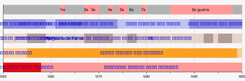 يمكننا أن نلاحظ ثماني حروب دينية: 1562-1563، 1567-1568، 1568-1570، 1572-1573، 1574-1576، 1576-1577، 1579-1580، 1585-1598. والأخيرة تحولت إلي حرب ضد ملك أسبانبا الذي دعم العُصبة.[21] وفي الواقع لقد عرفت فرنسا 36 عاماً من الاضطرابات يصاحبها فترتين من الهدوء النسبي [21]