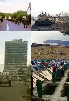 ![]() من اليمين بالأعلى عكس عقارب الساعة: دبابة مدمرة من معركة فوكوفار؛ الشرطة السلوفينية ترافق جنود من الجيش اليوغوسلافي إلى وحداتها أثناء حرب الاستقلال السلوفينية؛ مركبة تابعة للأمم المتحدة تجوب شوارع سراييفو أثناء حصار المدينة؛ إعادة دفن ضحايا مذبحة سربرنيتسا في 2010؛ قواعد مدفعية صربية مضادة للدبابات أثناء حصار دوبروفنيك | ||||||||||||
