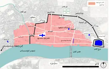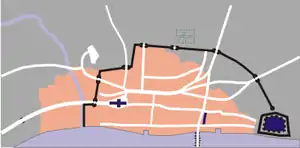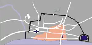 - تبلغ مساح المنطقة الي يحوطها الحائط الروماني 330 آكرًا استنادًا إلى ما تقولهه المراجع القياسية (انظر على سبيل المثال مرجع Sheppard، ص 37). غير أن Tinniswood يقدر مساحة المنطقة ميلاً مربعًا (أي 667 آكرًا).