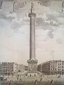 قام كريستوفر رن مع روبرت هوك، بطلب من الملك تشارلز الثاني، بتصميم نصب حريق لندن الكبير، وإقامته بالقرب من شارع بادينج لين، ويبلغ ارتفاعه 61 مترًا (200 قدم) وشاعت الإشارة إليه من قبل سكان لندن بـ "النصب التذكاري" اختصارًا، وتم إطلاق اسمه على واحدة من محطات مترو الأنفاق في لندن، إذ يعد واحدًا من أشهر المعالم التاريخية في العاصمة الإنجليزية. في عام 1668، تم القيام بعدة إضافات للكتابة المنقوشة على النصب التذكاري وقد تضمنت اتهامات واضحة للكاثوليك، منها المقطع التالي: