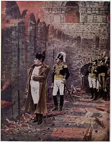 لم يعد لمدينة موسكو الفخورة الجميلة وجود. لقد تسبب روستوبشين في إحراقها. لقد تم القبض على أربعمائة من المحرقين عمداً وقد أقروا جميعاً بأنهم تلقوا أوامر بذلك من الحاكم مدير الشرطة. وقد تم إطلاق النيران عليهم. لقد دُمرت ثلاثة أرباع المنازل. إنه عمل لا جدوى منه كما أنه عمل آثم شرير. هل المقصود حرماننا من المؤن؟ إنها في مخازن لم تطلها النيران. يا له من هدف تافه، أَنُدمِّر من أجل هذا جهود قرون خلت وإحدى أجمل المدن في العالم! لا يمكنني أن أصدّق هذا. أهذا يتفق مع مبادئكم ومشاعركم وأفكاركم عمّا هو حق؟! أهذا الاسفاف جدير بحاكم عادل وأمة عظيمة؟. لقد قمتُ بشن الحرب على عظمتكم دون أية مشاعر عدائية. لقد كان خطاب واحد منكم قبل هذه المعركة الأخيرة أو بعدها كفيل بإيقاف أي تقدّم للجيش الفرنسي، بل لقد كنت قد تخلّيتُ راغباً عن احتلال موسكو، لو كنتم عظمتكم مازلتم تحتفظون لي ببعض المشاعر التي كنتم تكنونها لي سابقاً، لفسّرتم هذا الخطاب تفسيراً حسنا. وعلى أية حال فإنه لا يمكنكم إلا الموافقة على أن ما ذكرته عن حَرْق موسكو صحيح. |