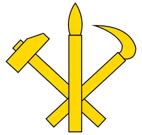 شعار حزب العمال الكوري يجمع بين المطرقة والمنجل والفرشاة الذين يمثلون على التوالي العمال والفلاحين وعمال المعرفة.