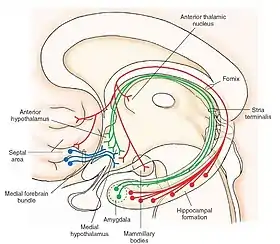 ![]() تخطيط تشريحي لحزمة الدماغ الأمامي الإنسية، وترتبط هذه الألياف العصبية المنطقة الفاصلة في الدماغ الأمامي بتحت المهاد الإنسي | |